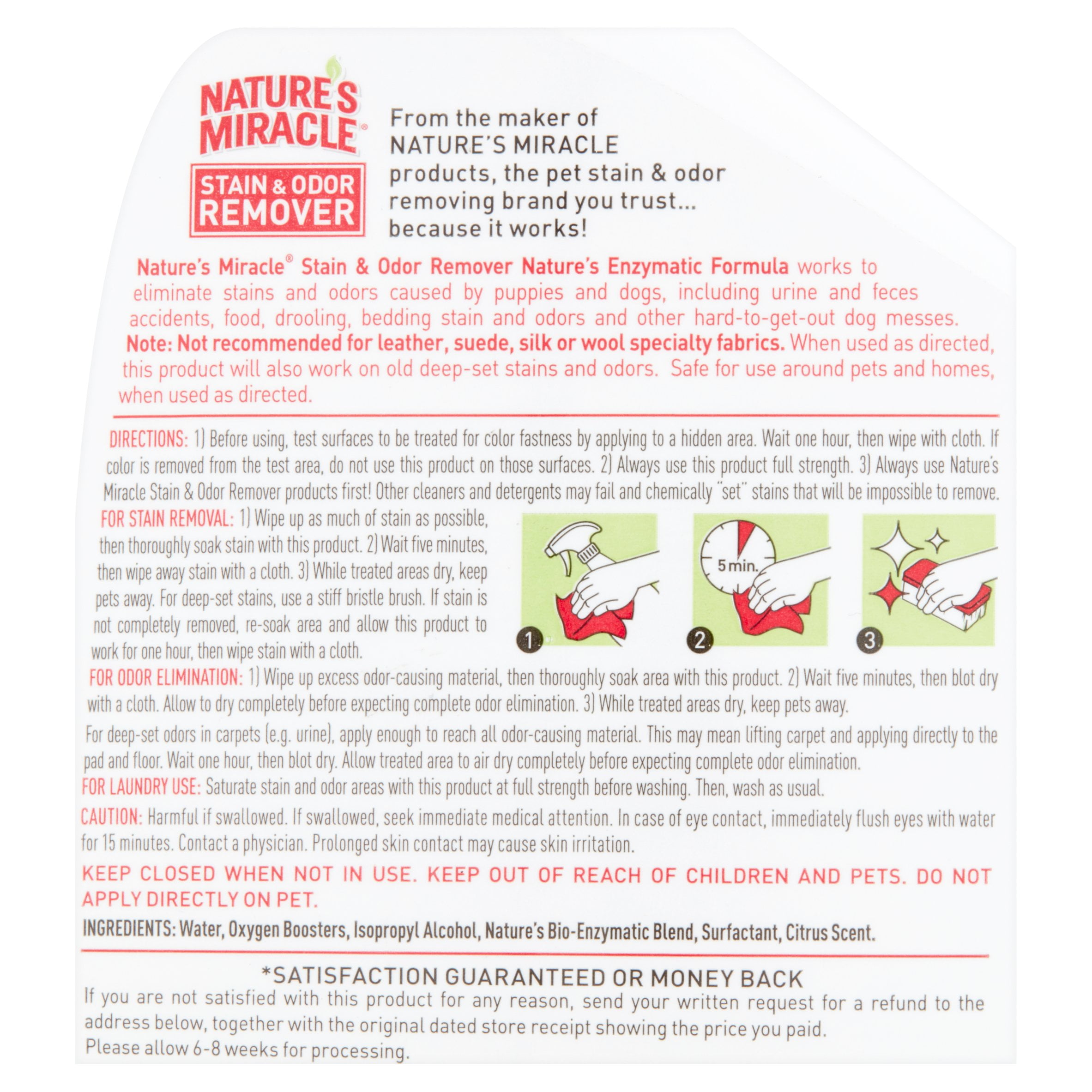 Enriched with moisturizing conditioners to leave skin and coat healthy and shiny. Natures Miracle Stain Odor Remover Natures Enzymatic Formula works to eliminate stains and odors caused by puppies and dogs including urine and feces accidents food drooling bedding stain and odors and other hard-to-get-out dog messes. Mother Natures Miracle TM contains a revitalizing combination of over 140 nutrients.