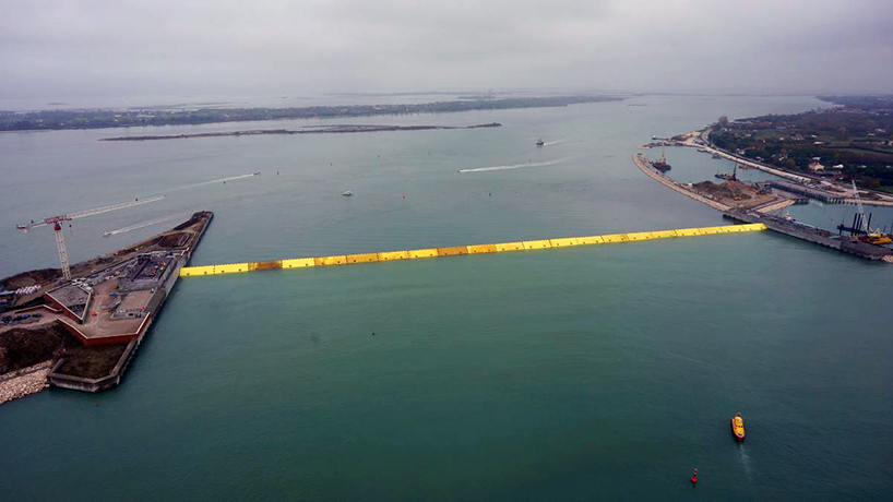 The ambitious project had dragged on for decades suffering from ballooning costs and repeatedly missed deadlines. The water-filled steel boxes range in size from 185 x 20 x 36 m to 295 x 20 x 45 m. The flood barrier consists of 78 bright yellow barriers that guard the entrance to the lagoon in Venice.