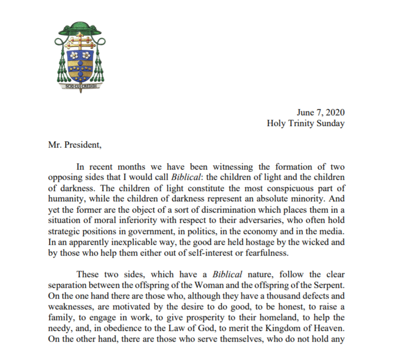 Apb Vigano Warns Pres Trump Of Spiritual Battle Waging Between Good And Evil In Open Letter