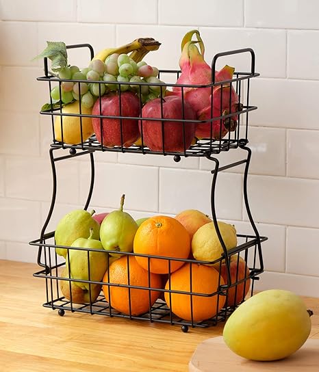 Amazon Com 2 Tier Fruit Basket Kitchen Counter Fruit Bowl Storage Holder For Fruits Vegetables Bread Snacks Housen Solutions Black Kitchen Dining